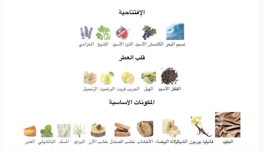 • المقدمة: نغمات بحرية 🌊، الكشمش الأسود 🍇، التين الأسود 🍈، الشيح 🌿، اللافندر 💜