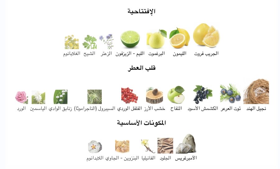 •القلب: نجيل الهند 🍃، توت العرعر 🌲، الكشمش الأسود 🍇، التفاح 🍏، الأرز 🌳، الفلفل الوردي 🌸، السايبرول 🌿، زنبق الوادي 🤍، الياسمين 🌼، الورد 🌹