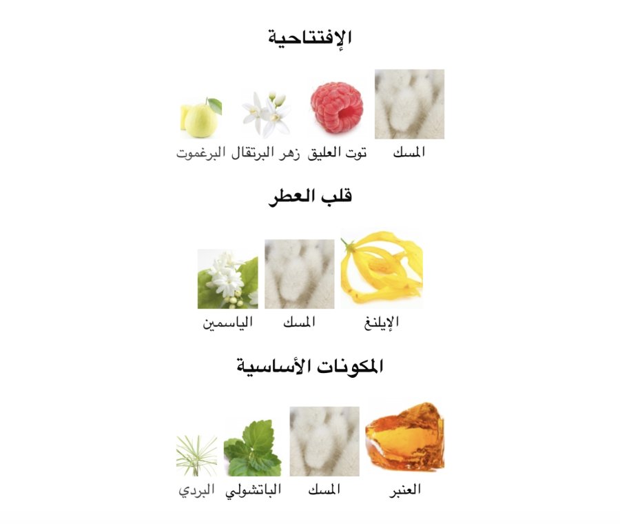 • المقدمة: المسك 🤍، التوت 🍓، زهر البرتقال 🍊، البرغموت 🍋