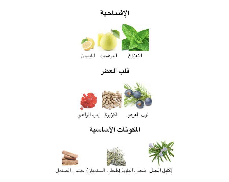 •القاعدة: إكليل الجبل 🌿، طحلب السنديان 🌿، خشب الصندل 🪵
