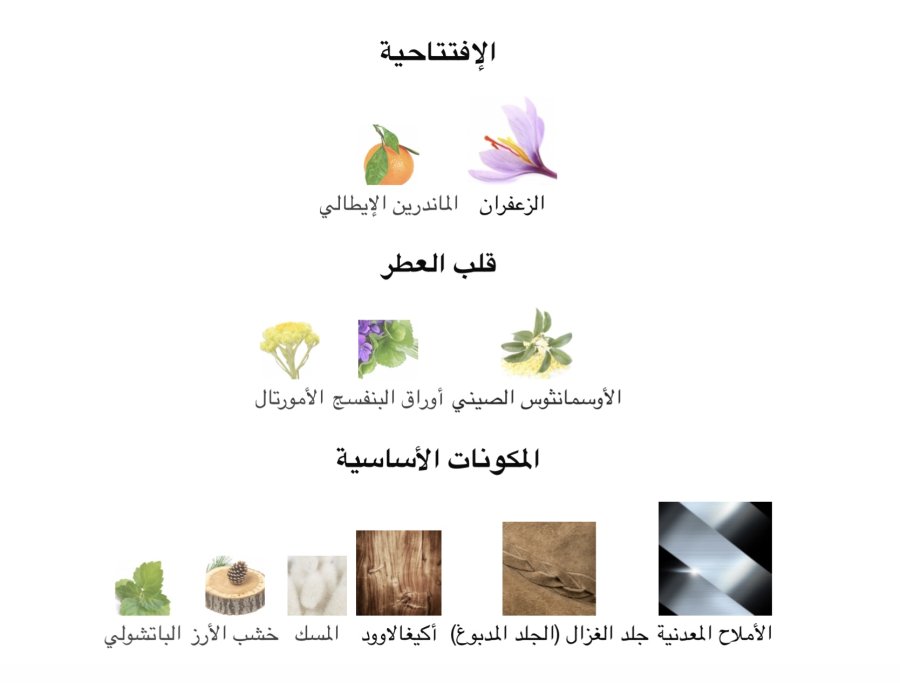 • القاعدة: النوتات المعدنية ⚪️، الجلد السويدي 🤍، أكيغالاوود 🌿، المسك 🤍، الأرز 🌲، الباتشولي 🌿