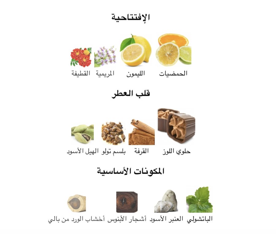 • القلب: البرالين 🍫، القرفة 🌶️، بلسم التولو 🌿، الهيل الأسود 🌑