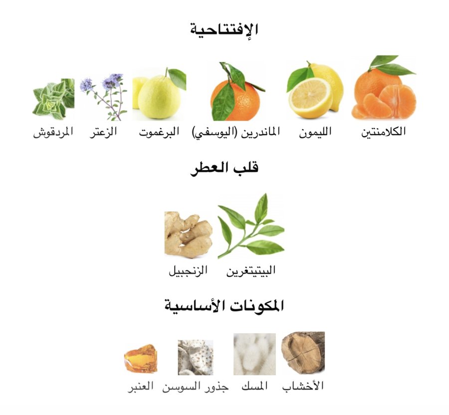 - المقدمة: كلمنتينا 🍊، ليمون 🍋، برتقال المندرين 🍊، البرغموت 🍃، الزعتر 🌿، المردقوش 🌱