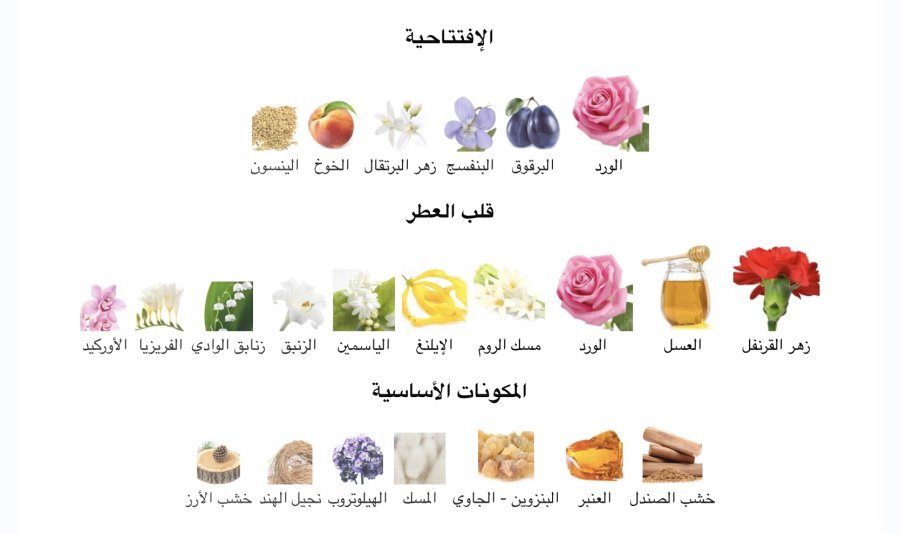 - القلب: العسل 🍯، القرنفل 🌸، الورد 🌹، التوبروز 🌼، الإيلنغ يلانغ 🌺، الياسمين 💐، الزنبق 🤍، زنبق الوادي 🌿، الفريزيا 🌸، الأوركيد 💮
