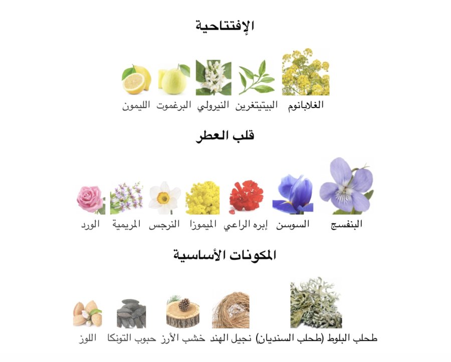 - المقدمة: الجالبانوم 🌿، البتيتغرين 🍋، زهر النيرولي 🌼، البرغموت 🍃، الليمون 🍋