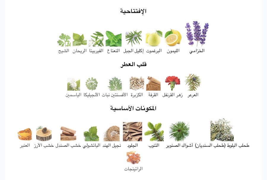 •القاعدة: طحلب السنديان 🌿 - إبر الصنوبر 🌲 - التنوب 🌲 - الجلد 🤎 - نجيل الهند 🌾 - الباتشولي 🌿 - خشب الصندل 🪵 - خشب الأرز 🌲 - العنبر 🧡 - الراتنجات 💎