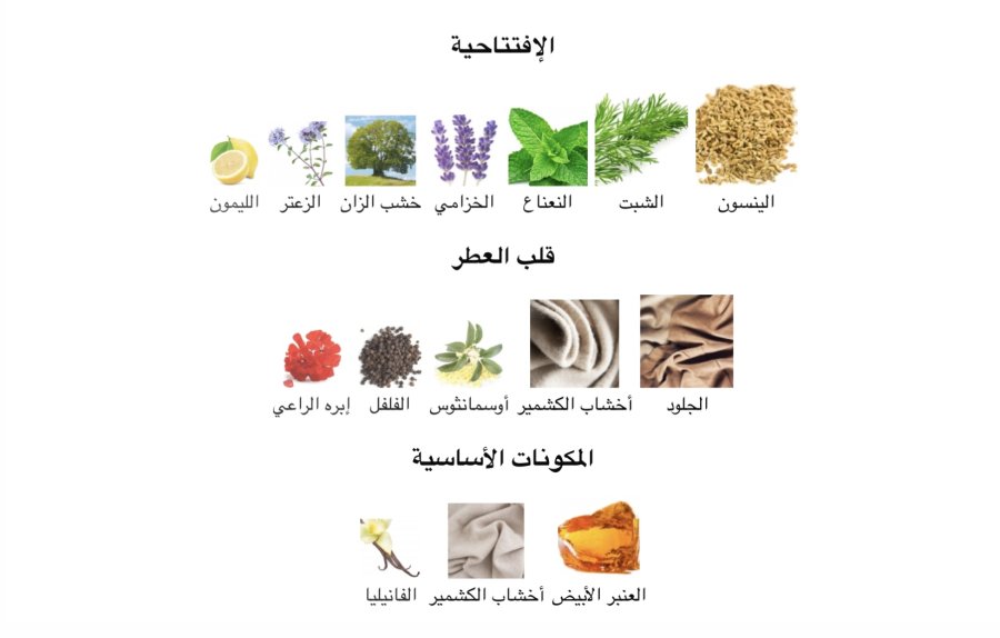 • القلب: الجلد 🖤، خشب الكشمير 🌲، الأوسمانثوس 🌼، الفلفل الأسود 🌶️، الجيرانيوم 🌺