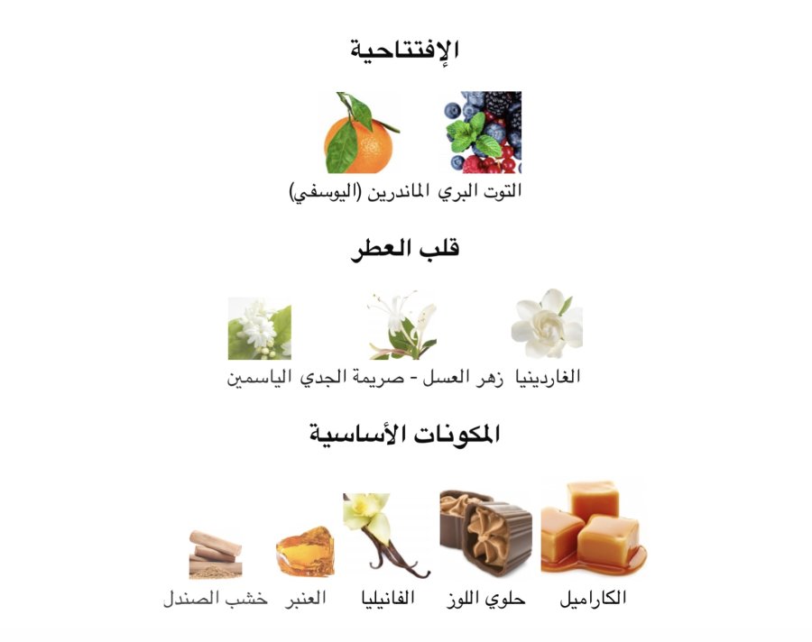 •القاعدة: الكراميل 🍬، البرالين 🍫، الفانيليا 🍦، العنبر 💛، خشب الصندل 🪵