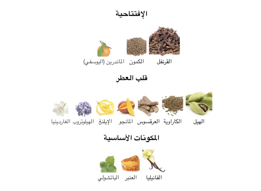 • القلب: الهيل 🌿، الكراوية 🌱، عرق السوس 🍬، المانجو 🥭، الإيلنغ-إيلنغ 🌼، الهليوتروب 🌸، الغاردينيا 🌼