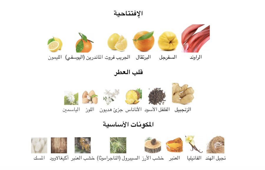 • القاعدة: نجيل الهند 🌱، الفانيليا 🍦، الكهرمان ✨، الأرز 🌲، زيت السايبريول 🌿، عنبر وود 🌳، أكيغالاوود 🌿، المسك 🤍