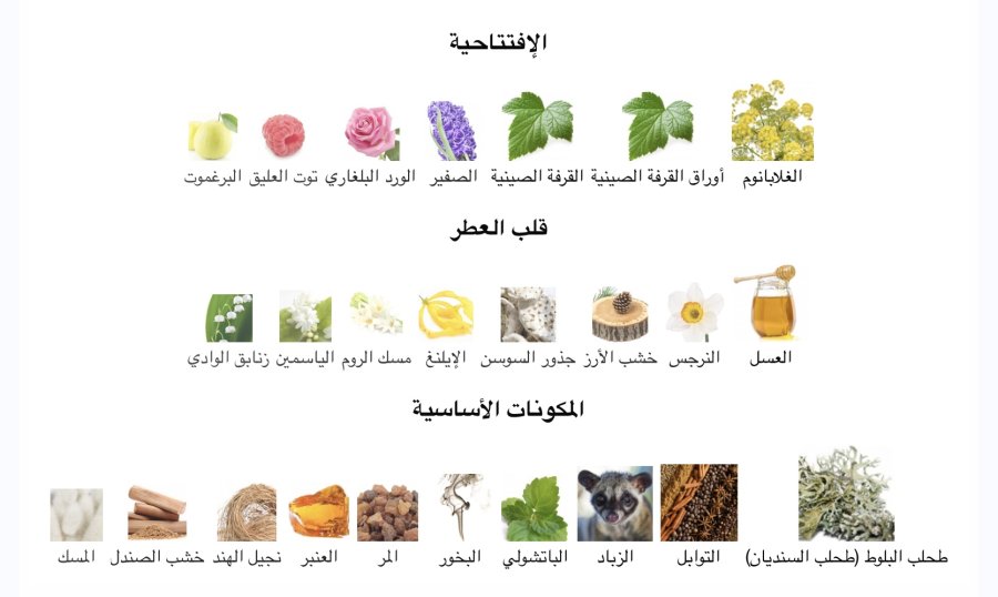 •القاعدة: طحلب البلوط 🌿، التوابل 🌶️، الزباد 🐾، الباتشولي 🌿، اللبان 🔥، المرّ 🪔، العنبر 🧡، نجيل الهند 🌾، خشب الصندل 🪵، المسك 🤍