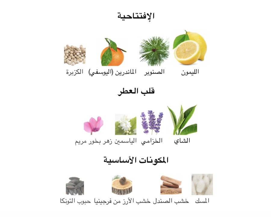 •المقدمة: ليمون أمالفي 🍋، الصنوبر 🌲، اليوسفي 🍊، الكزبرة 🌿