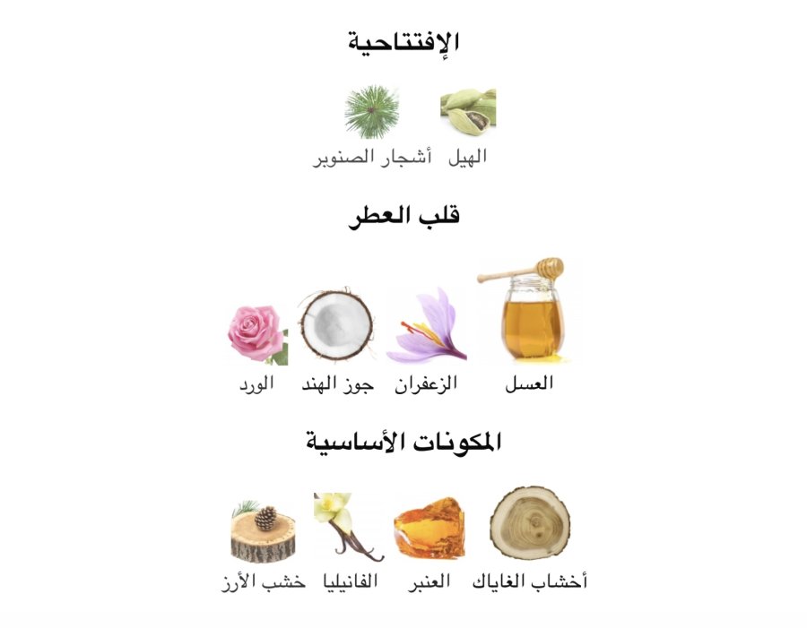 • القلب: العسل 🍯، الزعفران 💛، جوز الهند 🥥، والورد 🌹