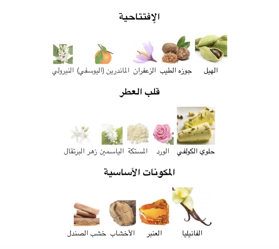 •المقدمة: الهيل 🌿، جوزة الطيب 🌰، الزعفران 🌸، اليوسفي 🍊، زهر النارنج 🌼