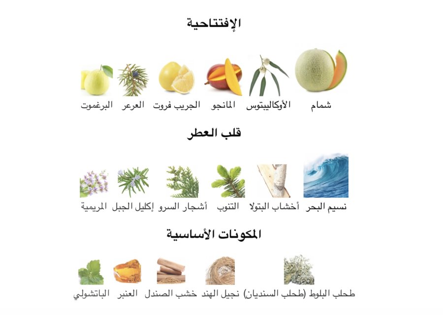 - القلب: نوتات بحرية 🌊، شجرة البتولا 🌳، التنوب 🌲، السرو 🌿، إكليل الجبل 🌿، الميرمية 🌱