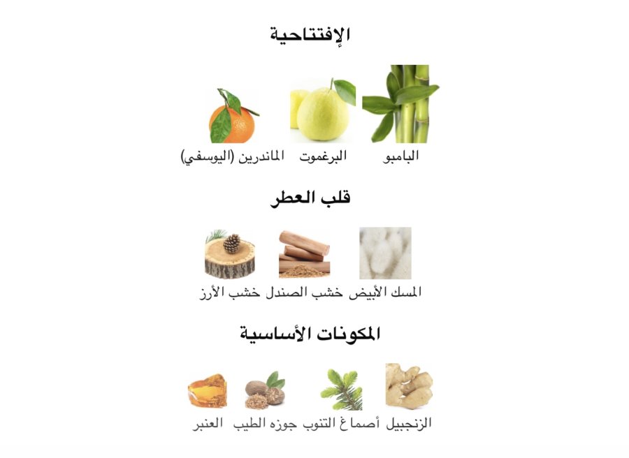 •القلب: المسك الأبيض، خشب الصندل، الأرز