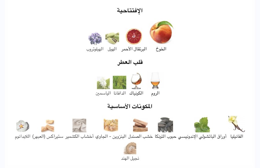 • القاعدة: الفانيليا 🍦، أوراق الباتشولي الإندونيسي 🌿، فول التونكا 🌰، خشب الصندل 🌳، البنزوين ✨، الكاشميران 🤍، الستايراكس 🌿، اللابدانوم 🌸، نجيل الهند 🌾