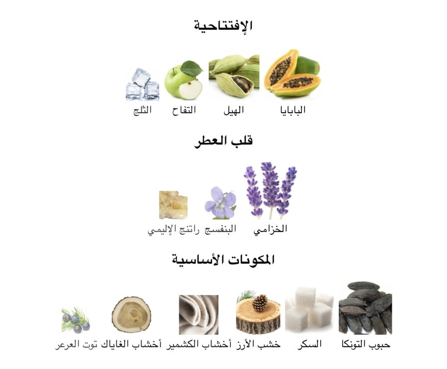 • القاعدة: التونكا 🌰، السكر 🍬، الأرز 🌲، خشب الكشمير 🌿، خشب الغاياك 🌳، العرعر 🌿