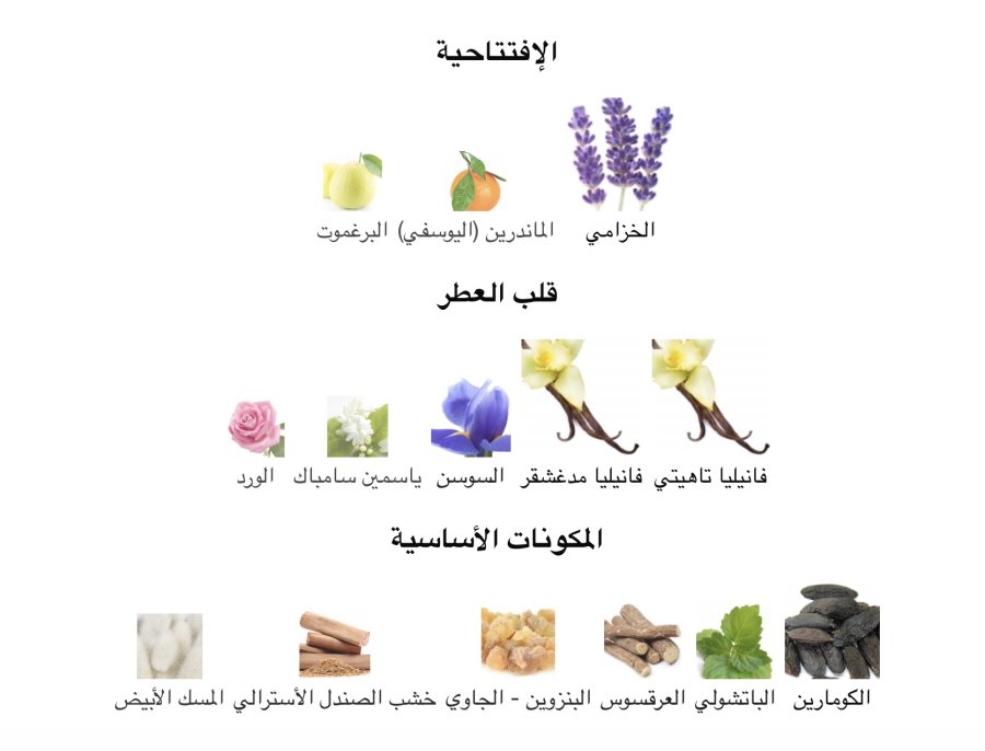 • القلب: فانيليا تاهيتي 🍦، فانيليا مدغشقر 🌿، السوسن 🌸، الياسمين السامباك 🤍، الورد 🌹