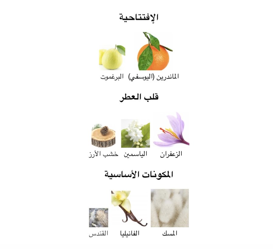 • القلب: الزعفران 🌸، الياسمين 🌼، والأرز 🌳