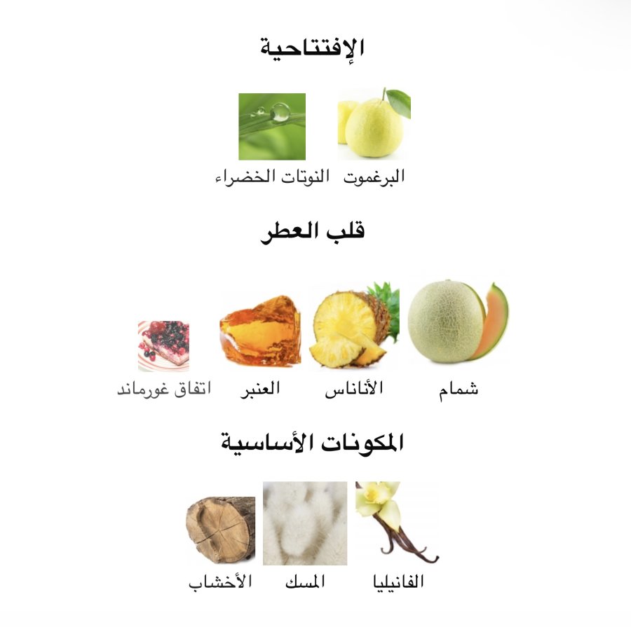 • القلب: الشمام 🍈، الأناناس 🍍، العنبر 🧡، نوتات غورماند اللذيذة 🍮