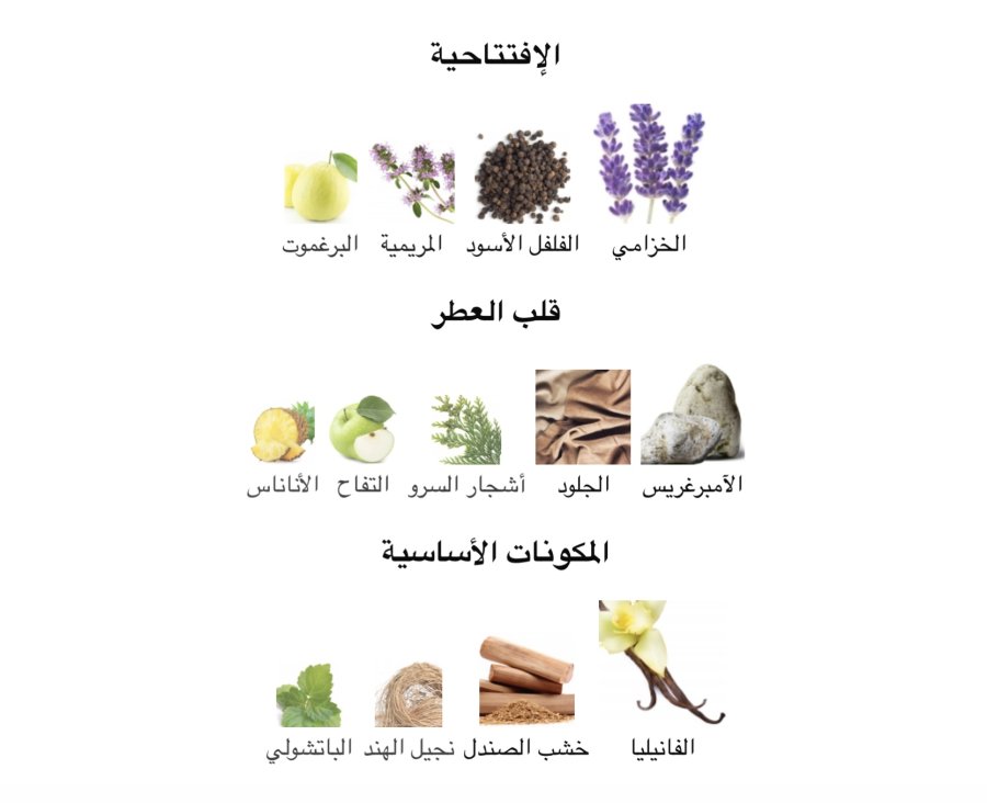 •القلب: أمبرغريس 🌊، الجلد 🧥، السرو 🌲، التفاح 🍏، الأناناس 🍍