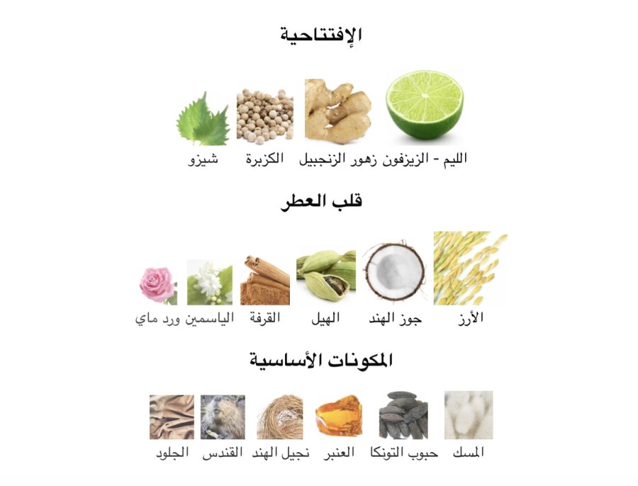 • القلب: الأرز 🌾، جوز الهند 🥥، الهيل 🌿، القرفة 🌰، الياسمين 🌸، ورد مايو 🌹
