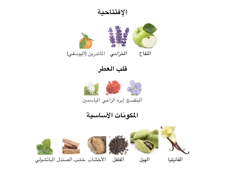 • القاعدة: الفانيليا 🍦، الهيل 🌿، الفلفل الأسود 🌶️، الأخشاب 🌳، الصندل 🤎، الباتشولي 🌿
