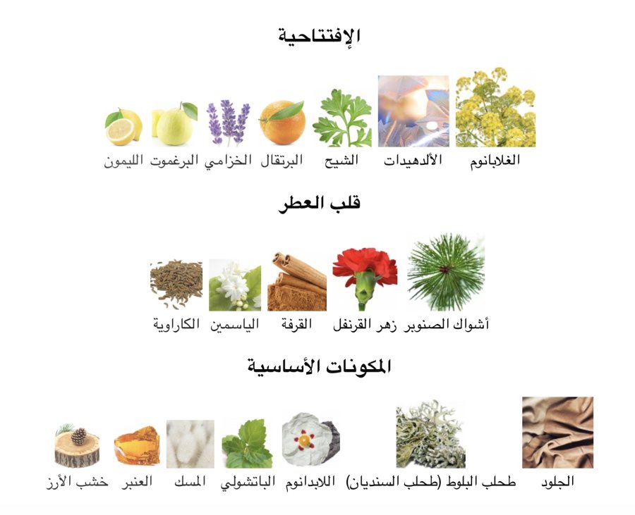 - المقدمة: الجالبانوم 🌿، الألدهيدات ✨، الشيح 🌾، البرتقال 🍊، اللافندر 💜، البرغموت 🍋، الليمون 🍋