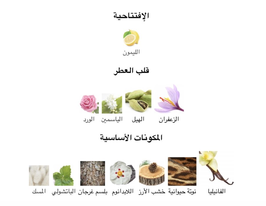 • القلب: الزعفران 🌸، الهيل 🌿، الياسمين 🤍، الورد 🌹
