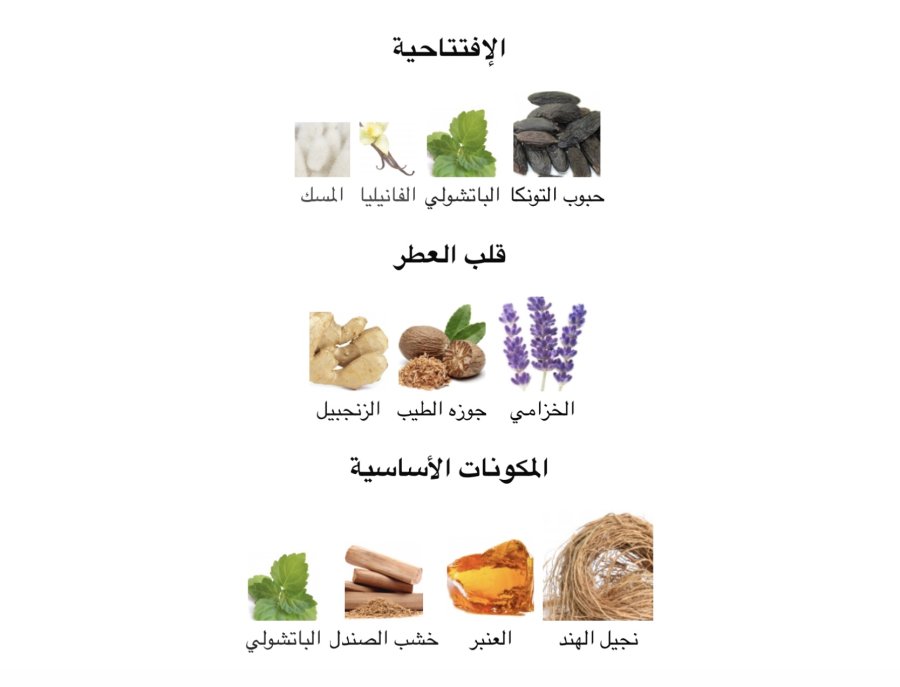 • القاعدة: نجيل الهند 🌱، العنبر 🧡، خشب الصندل 🌳، الباتشولي 🌿