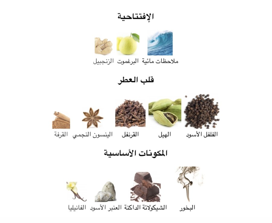 • القاعدة: البخور 🕯️، الشوكولاتة الداكنة 🍫، العنبر الأسود ✨، الفانيليا 🍦