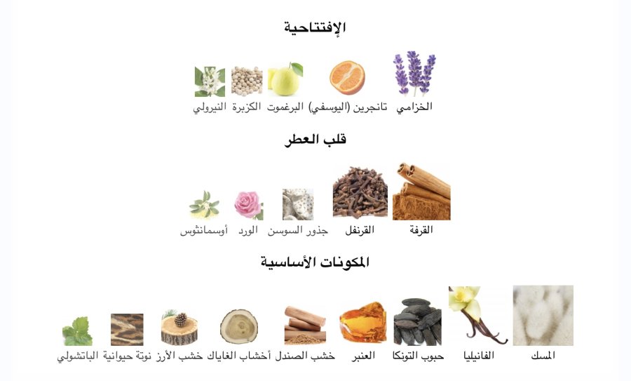• القاعدة: المسك 🤍، الفانيليا 🍦، التونكا 🌿، العنبر ✨، خشب الصندل 🌲، خشب الغاياك 🌳، الأرز 🌲، النوتات الحيوانية 🦌، الباتشولي 🌿