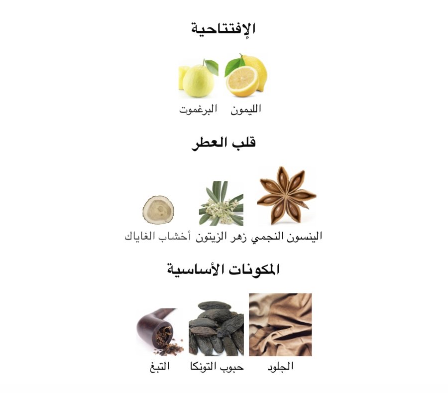 • القلب: اليانسون النجمي ⭐، زهر الزيتون 🌸، خشب الغاياك 🌲