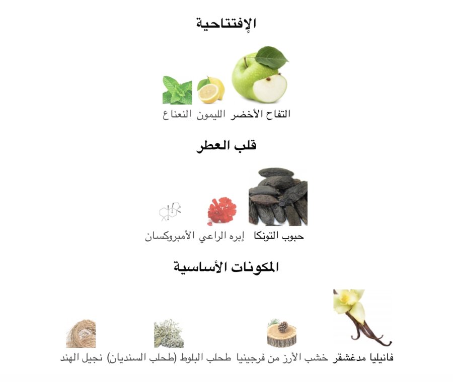 - القاعدة: فانيليا مدغشقر 🍦، خشب الأرز من فرجينيا 🪵، طحلب السنديان 🌿، نجيل الهند 🌾
