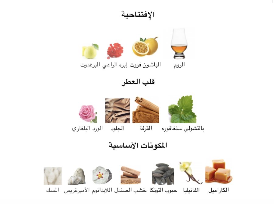 • القاعدة: الكراميل 🍯، الفانيليا 🍦، التونكا 🌰، خشب الصندل 🌾، اللابدنوم 🌿، الأمبرغريس 💎، والمسك 🤍